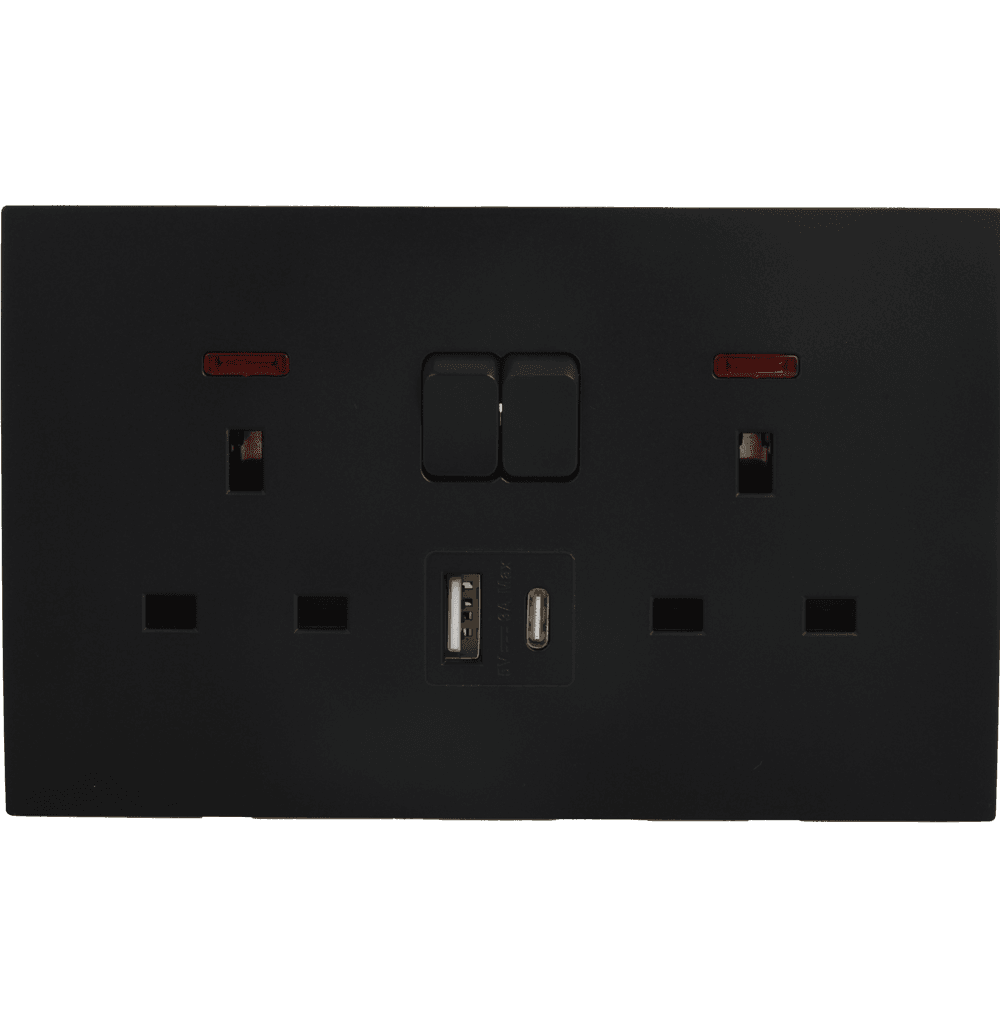 VIRAGO 13Amp. Twin 1Pole Switched Socket Outlet with Indicator with Type-A + Type-C USB Charger Outlet Black